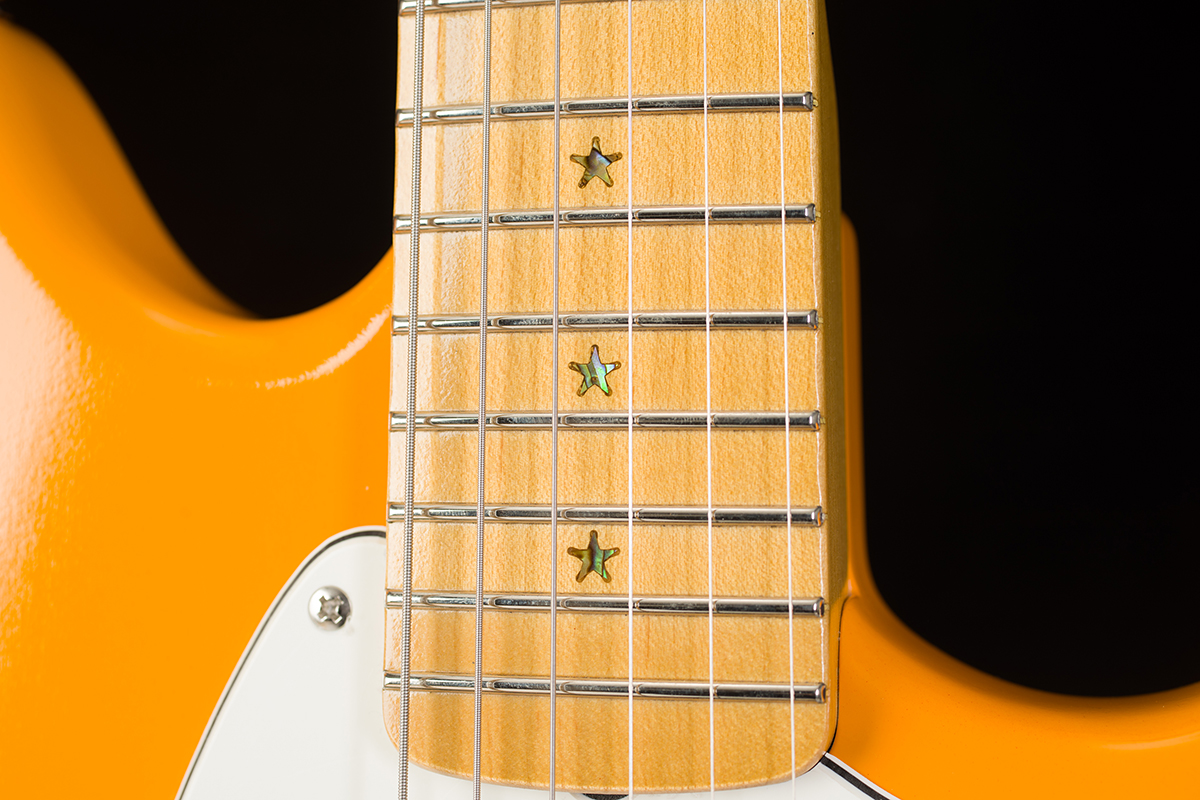 Moon Guitars定番の22フレット仕様に華やかなアバロンの星型ポジションマーク。