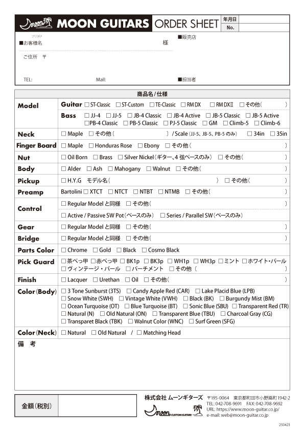 カスタムコンポーネントのお見積り・オーダーの際は、下記の「オーダーシート」をダウンロード/プリントアウトしていただき、必要事項をご記入のうえFAXにてMoon Guitarsまでご送付をお願い致します。